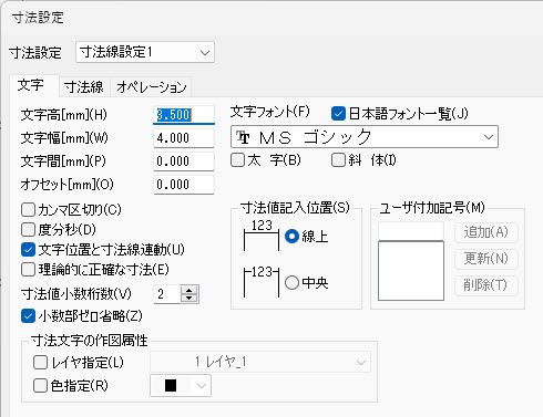 AutoCAD形式(DXF/DWG)を入力する際に、[設定]-[寸法設定]コマンドの設定値を使用して端部記号・文字フォント・文字サイズを指定することができます。
