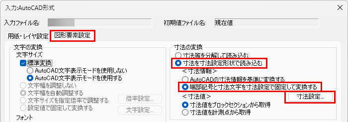 [図形要素設定]タブをクリックします。 - [寸法の変換]の[寸法を寸法設定形状で読み込む][端部記号と寸法文字を寸法設定で固定して変換する]にチェックを付け、[寸法設定]ボタンを押します。