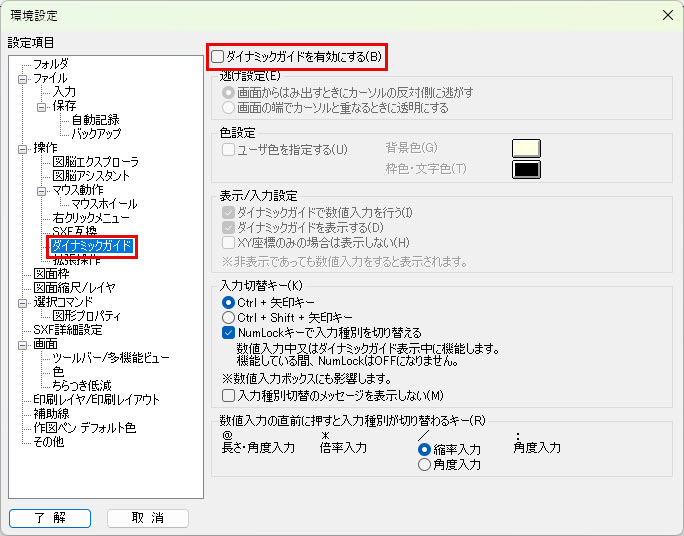 画面左側の[設定項目]欄の[操作]-[ダイナミックガイド]をクリックします。