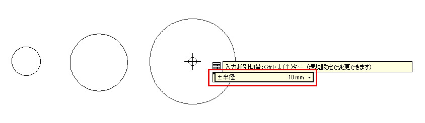 [作図]-[円/円弧]-[円(中心)]コマンドなどで半径を指定して作図すると、作図するたびに円が指定した数値より大きくなる場合は、図脳CADの設定が「相対値入力」の状態になっている可能性があります。