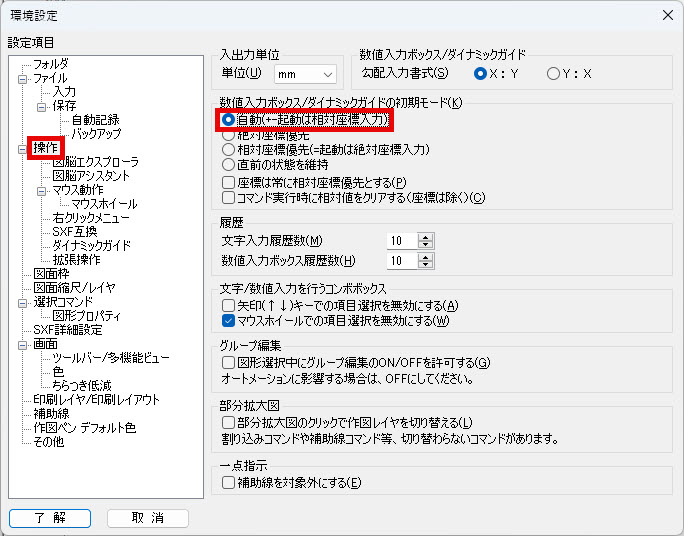 - 右側の[数値入力ボックス/ダイナミックガイドの初期モード]欄(図脳RAPIDの場合は[数値入力ボックスの初期モード]欄])で[自動(+-起動は相対座標入力)]を選択します。