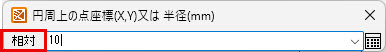 図脳RAPIDPROでダイナミックガイドを使用している場合は、半径入力欄に[±半径]と表示されており相対値入力の状態となっているため、直前に入力した値に「+10mm」した円が作図されます。
