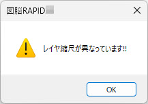『図脳RAPID』で異縮尺図面を編集中に「レイヤ縮尺が異なっています!!」とメッセージが出る場合は、下記のいずれかの方法でご対応ください。