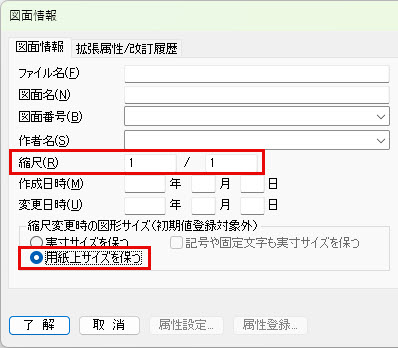 図面の縮尺を確認し、[縮尺変更時の図形サイズ(初期値登録対象外)]欄で[用紙上サイズを保つ]を選択します。 - [了解]ボタンを押します。