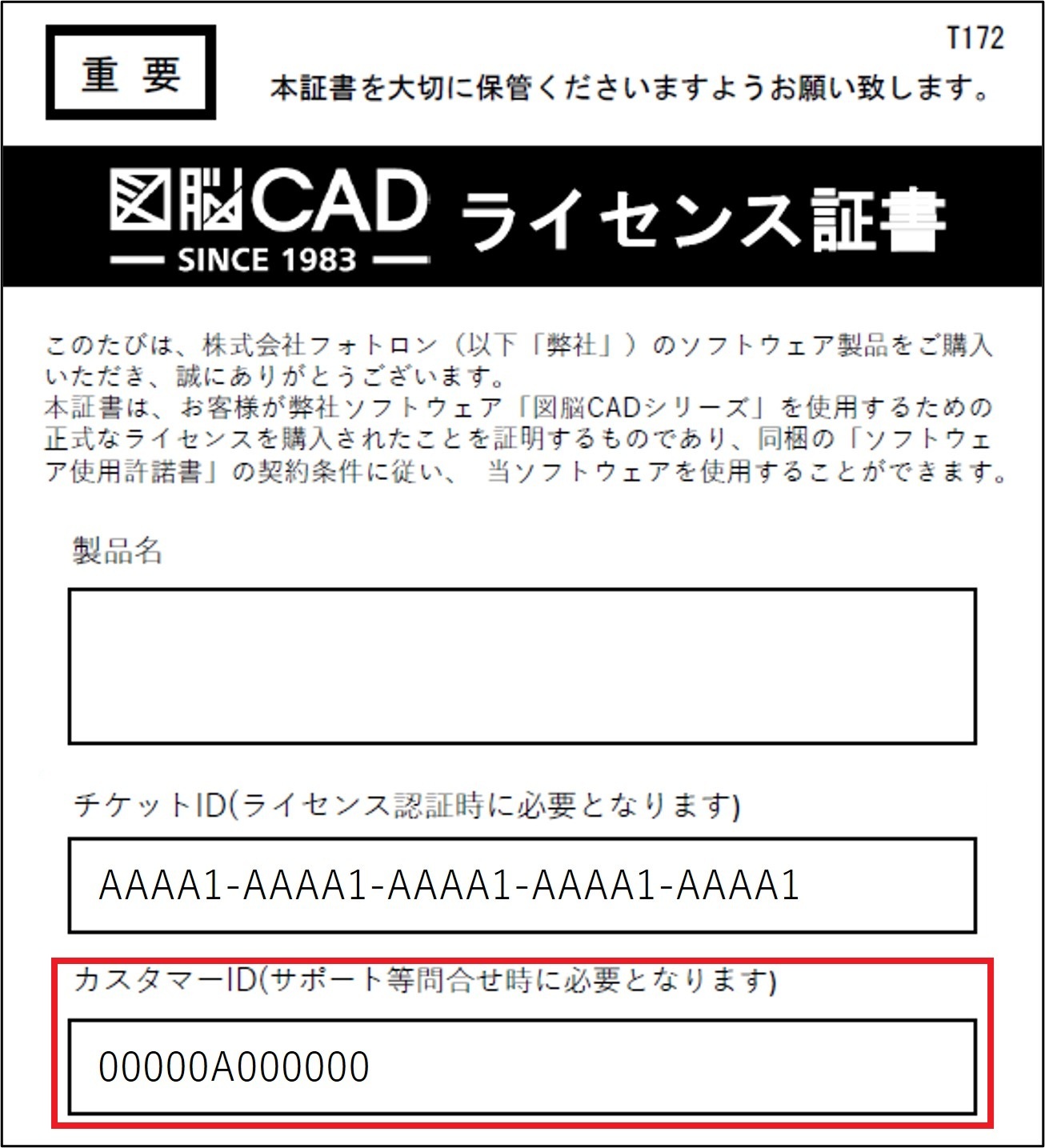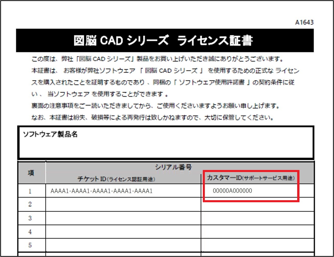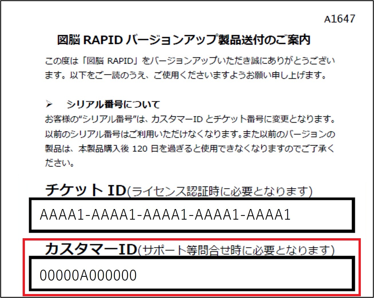 製品パッケージに同梱の「ライセンス証書」または「図脳RAPIDバージョンアップ製品送付のご案内」に記載されております「カスタマーID」欄をご確認ください。