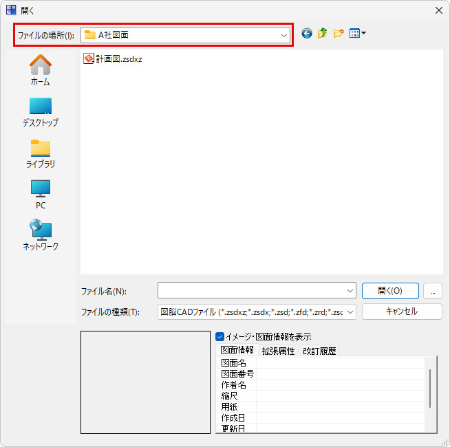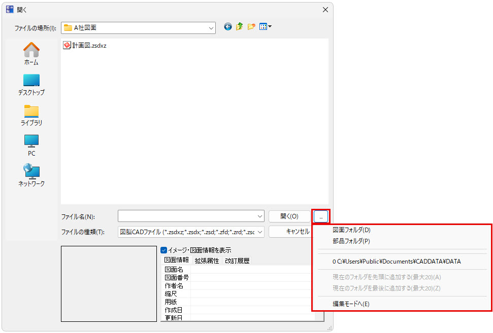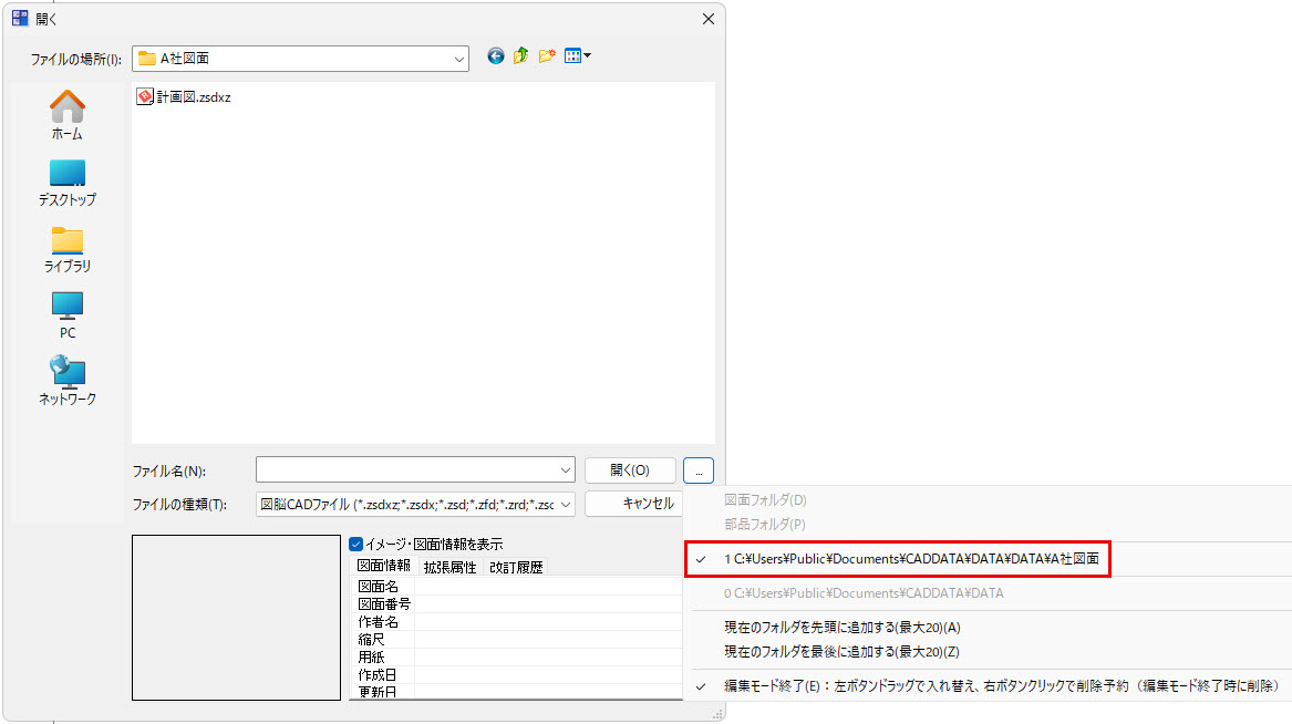 図脳RAPIDPRO23より、[開く]や[名前を付けて保存]コマンドのダイアログボックスから、目的のフォルダへ簡単にアクセスできるようになりました。