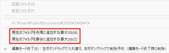 従来のバージョンでは、最初に開かれるフォルダの指定は1つのみ(※)でしたが、図脳RAPIDPRO23以降では、よく使うフォルダを最大20個までショートカット登録することが可能です。