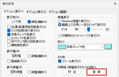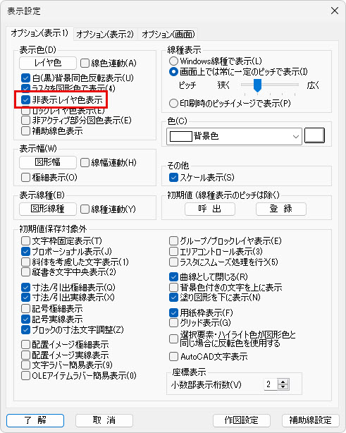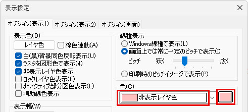 [オプション(表示1)]タブをクリックします。 - [表示色]欄の[非表示レイヤ色表示]にチェックを付けます。