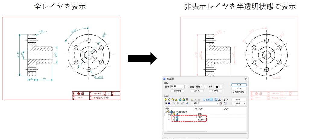 図脳RAPID23シリーズ以降で、非表示設定したレイヤに属する図形を半透明状態で表示することができます。非表示レイヤ色は、サーチ・選択・印刷の対象外となります。
