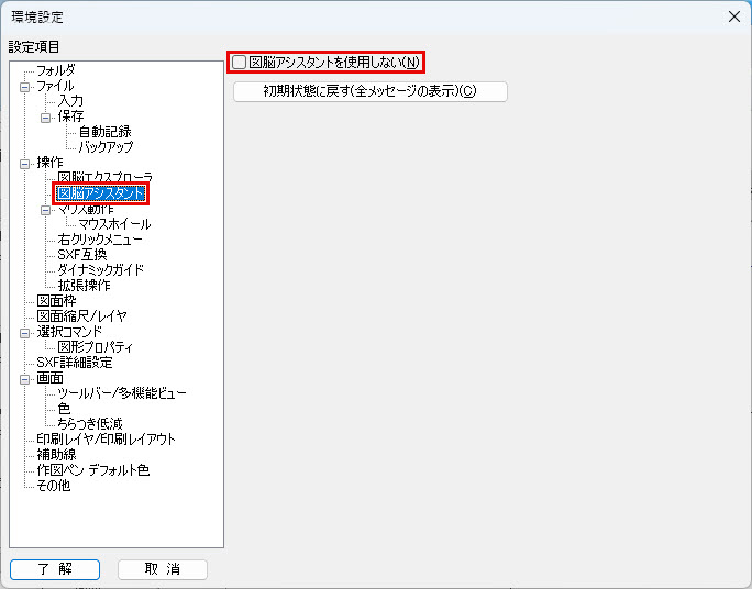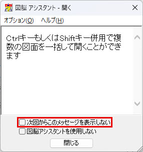 なお、操作に習熟した後は、図脳アシスタント内の[次回からこのメッセージを表示しない]にチェックを付けることで個別に非表示にしたり、再び[環境設定]コマンドから機能自体をオフにしたりすることも可能です。習熟度に合わせて柔軟に使い分けることで、常に最適な作業環境を維持できます。