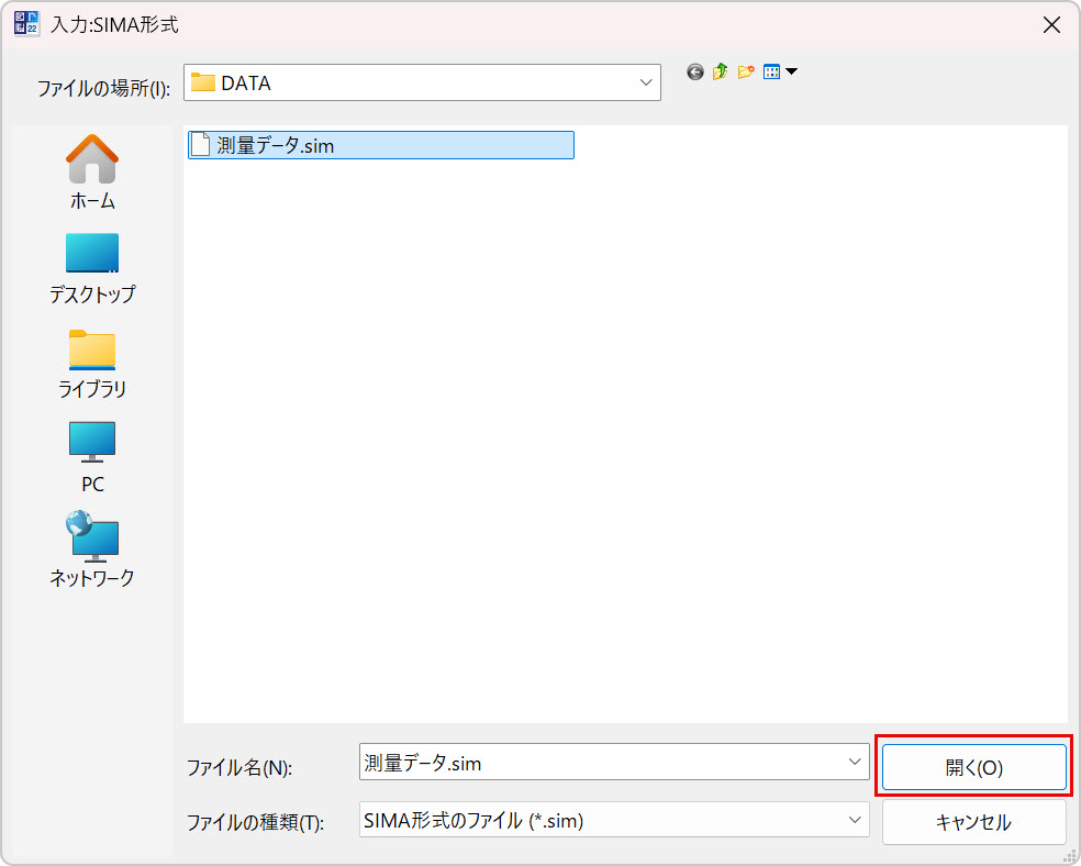 SIMA形式のファイル(拡張子:.sim)を選択して、[開く]ボタンを押します。