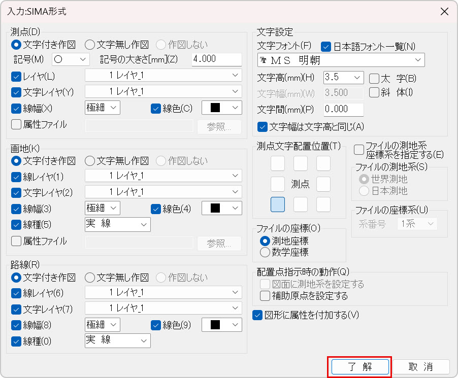 | ファイルの座標 | [測地座標]を選ぶと、X値を縦軸・Y値を横軸としたSIMAデータとみなして読み込みます。[数学座標]を選ぶと、X値を横軸・Y値を縦軸としたSIMAデータとみなして読み込みます。 |