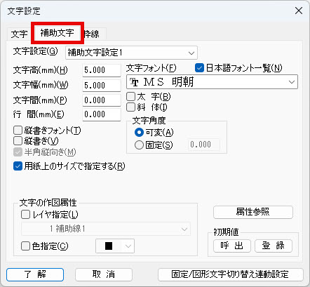 - [補助文字]タブでは、[補助]-[補助文字]コマンドで作図する補助文字の書式を設定します。