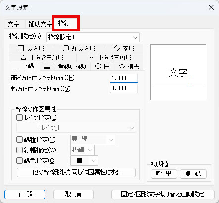 [枠線]タブでは、[作図]-[文字]-[枠付き文字]コマンドで作図する文字の枠線の設定を行います。