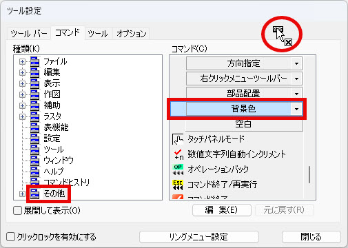- 右側の[コマンド]の一覧の[背景色▼]の上にカーソルをあてた状態で、マウスの左ボタンを押したままにします(カーソルの右下に[×]マークが表示されます)。
