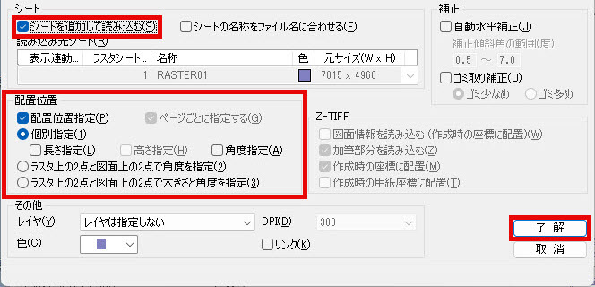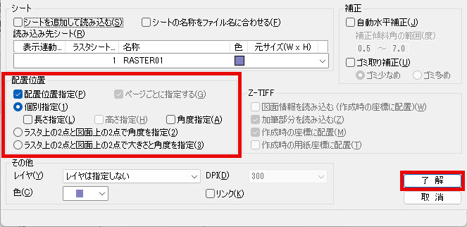- [ラスタ読み込み]ダイアログボックスが表示されます。