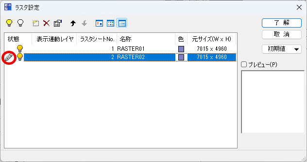 - ラスタを編集する場合は、[ラスタ]-[ラスタ設定]コマンドで操作対象のラスタ(アクティブなラスタシート)を切り替える必要があります。