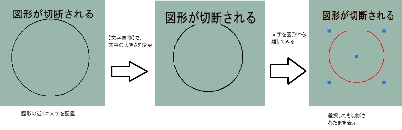 文字が図形にかかってしまうと、その図形が切断されてしまいます。